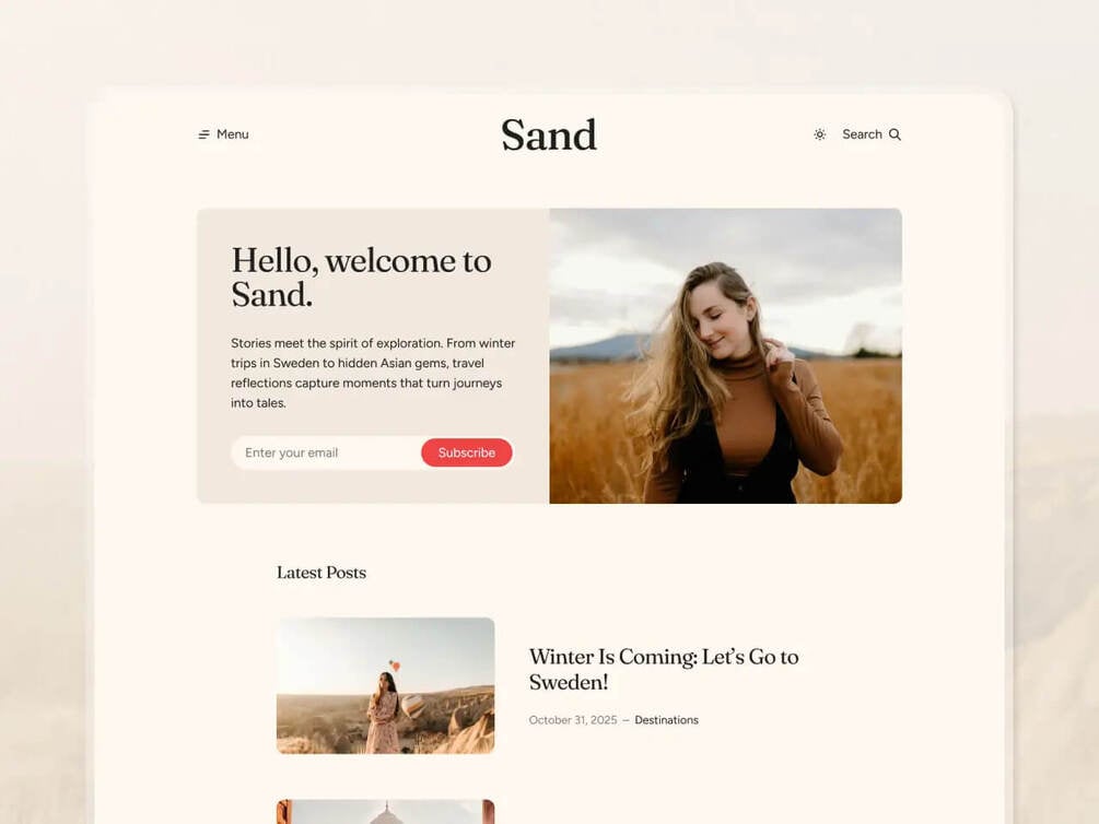 Sand is a Ghost theme made for people who love to share stories. Inspired by the simplicity of travel and clean design, it offers a relaxed reading experience. It works perfectly for personal blogs, travel journals, or any publication that values authenticity and storytelling.
